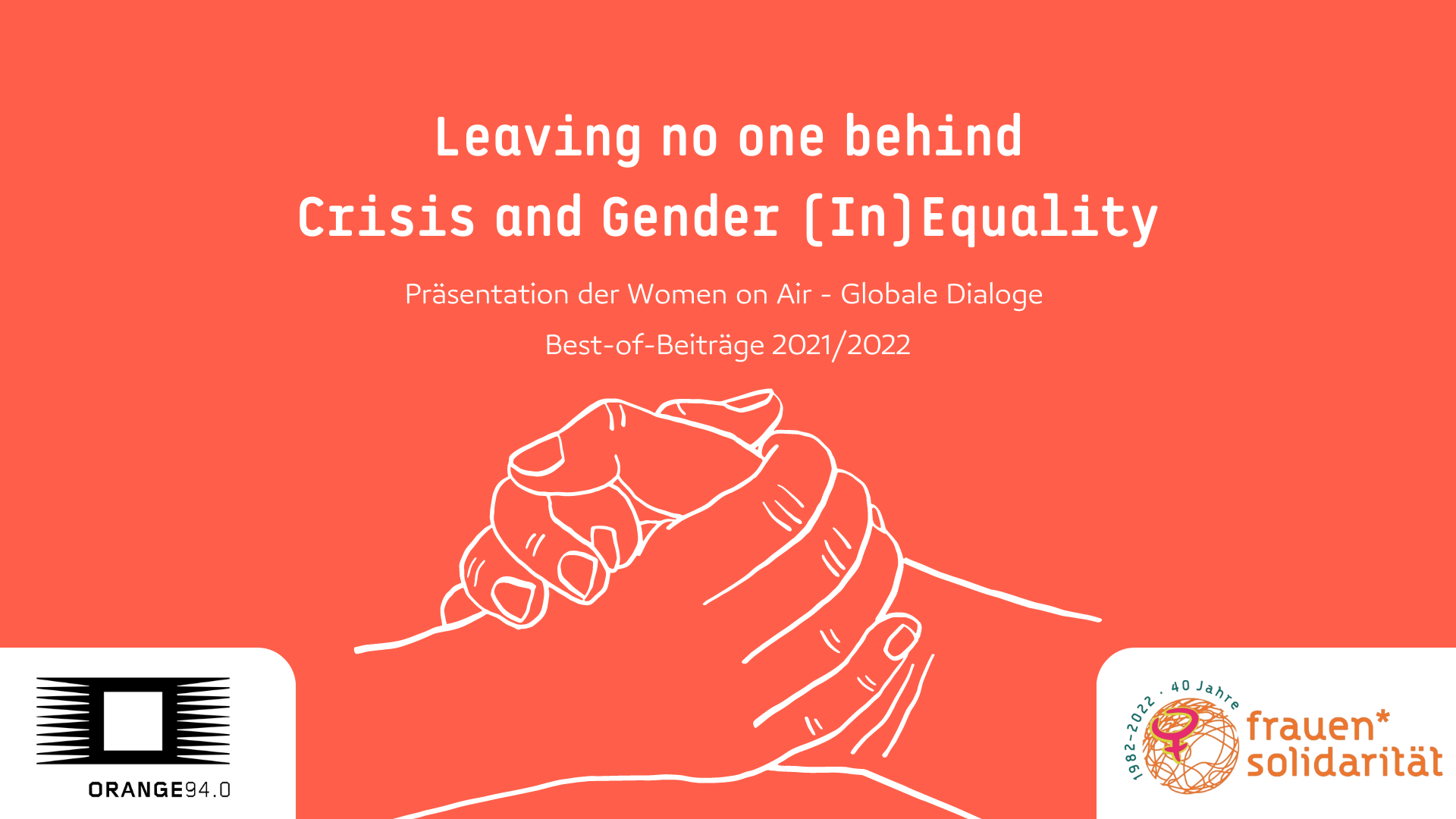 Wir präsentieren die neue Ausgabe der Zeitschrift frauen*solidarität zu den Themen Engaging Men, sowie Literatur und Sprache. Vorgestellt wird auch die Best-of Kompilation 2021/22 zum Thema „Leaving no one behind – Crisis & Gender (In)Equality“ der Sendereihe Globale Dialoge – gestaltet von der Redaktionsgruppe Women on Air.